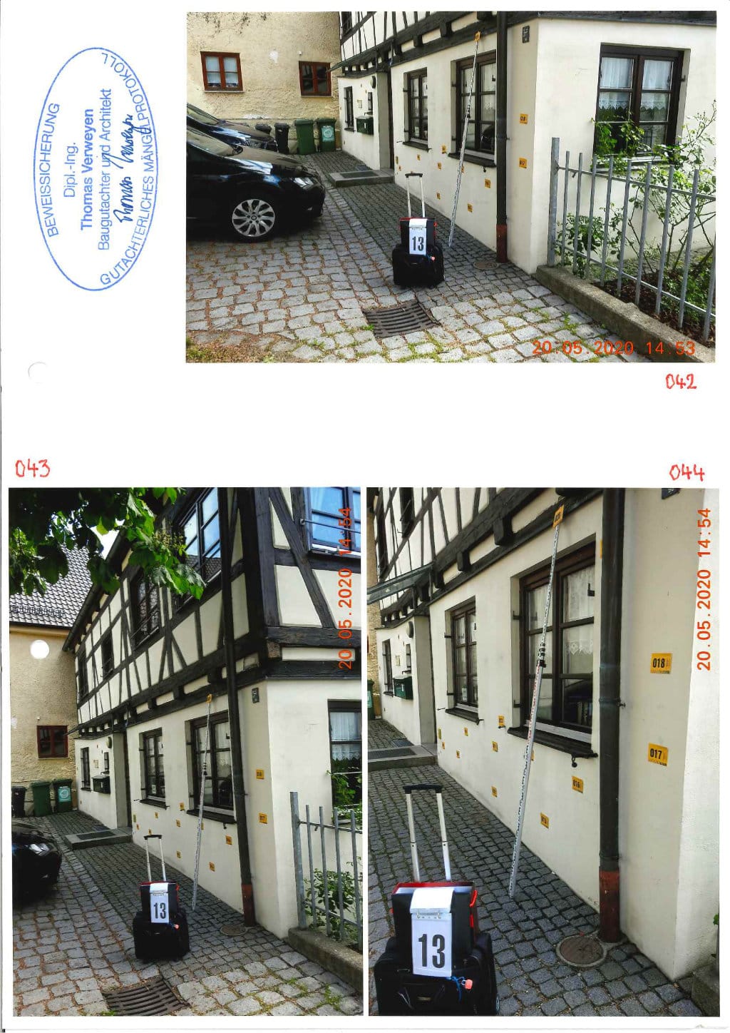 Pos. 2.02: Die Beweissicherung ist eine sehr genaue Auseinandersetzung mit dem Objekt und seiner Mängellast. Ziel ist es, nicht nur den Mangel zu erfassen, sondern auch seine wichtige Ursache aufzuspüren. Mit dem Ursachenwissen und meiner Erfahrung bei der Sanierungsvorgehensweise, lassen sich (im schriftlichen Gutachten, siehe Pos. 2.04) die notwendigen Sanierungskosten viel zutreffender nachweisen. Der beweissichernde Faktor wird hier erreicht durch: