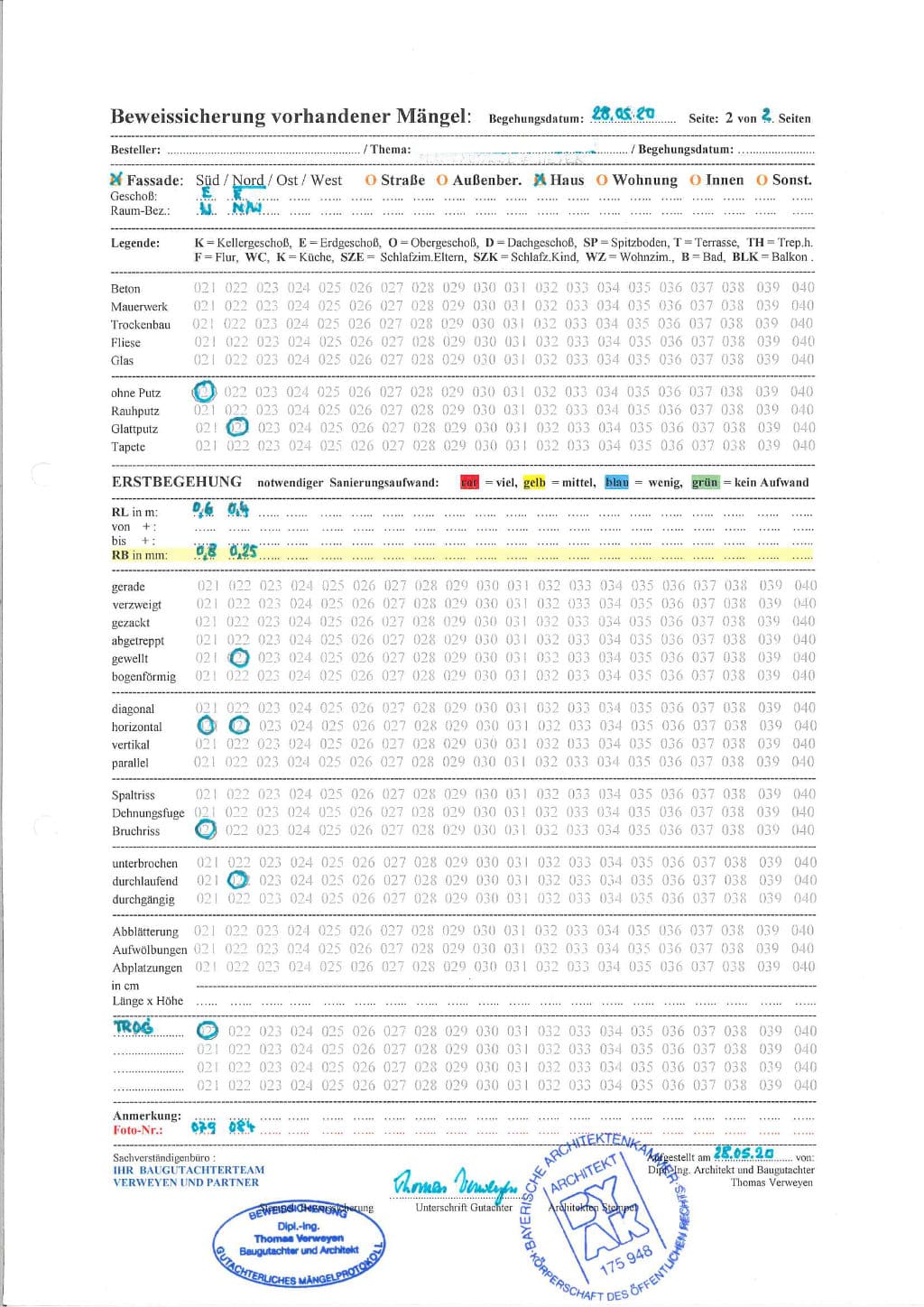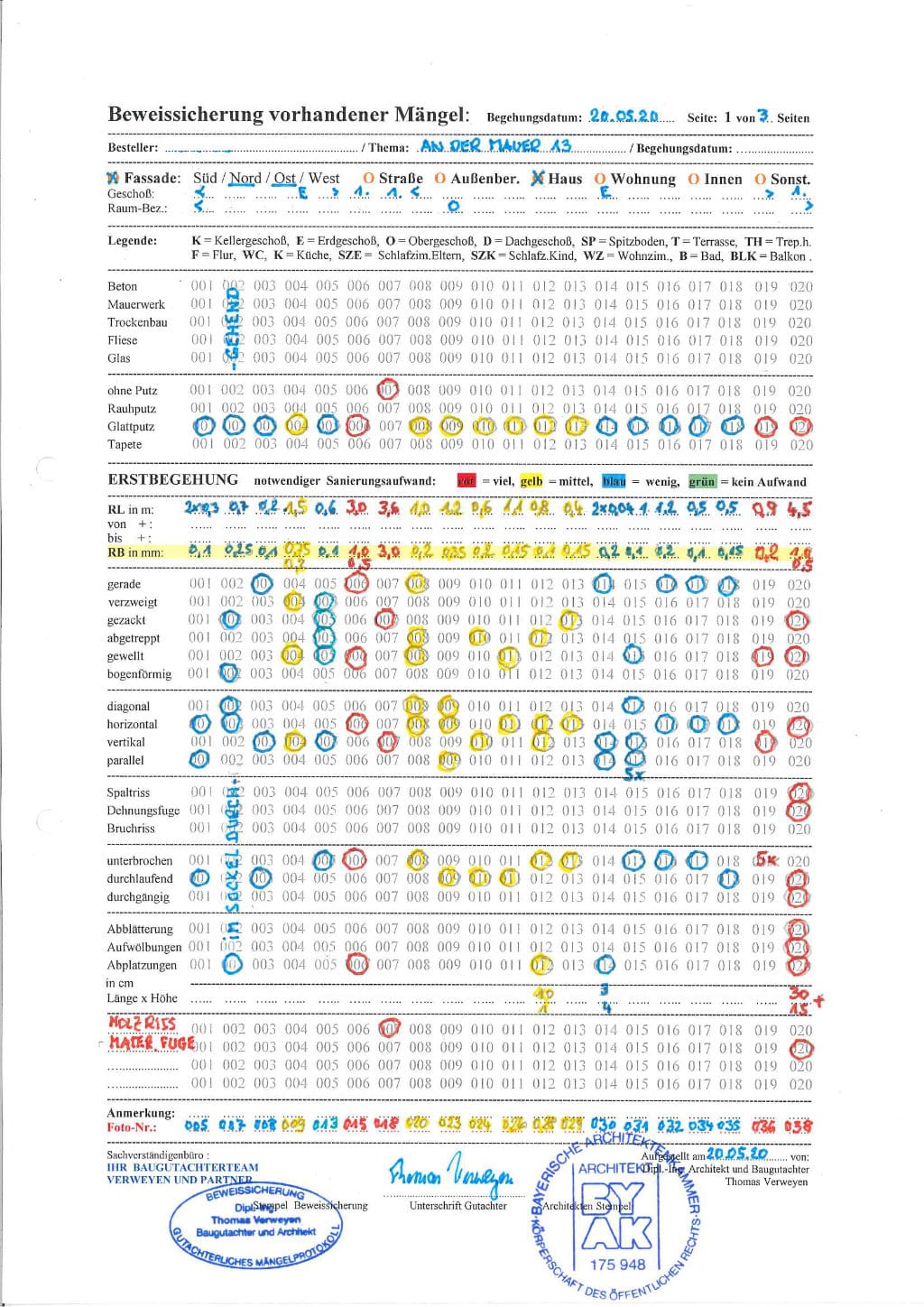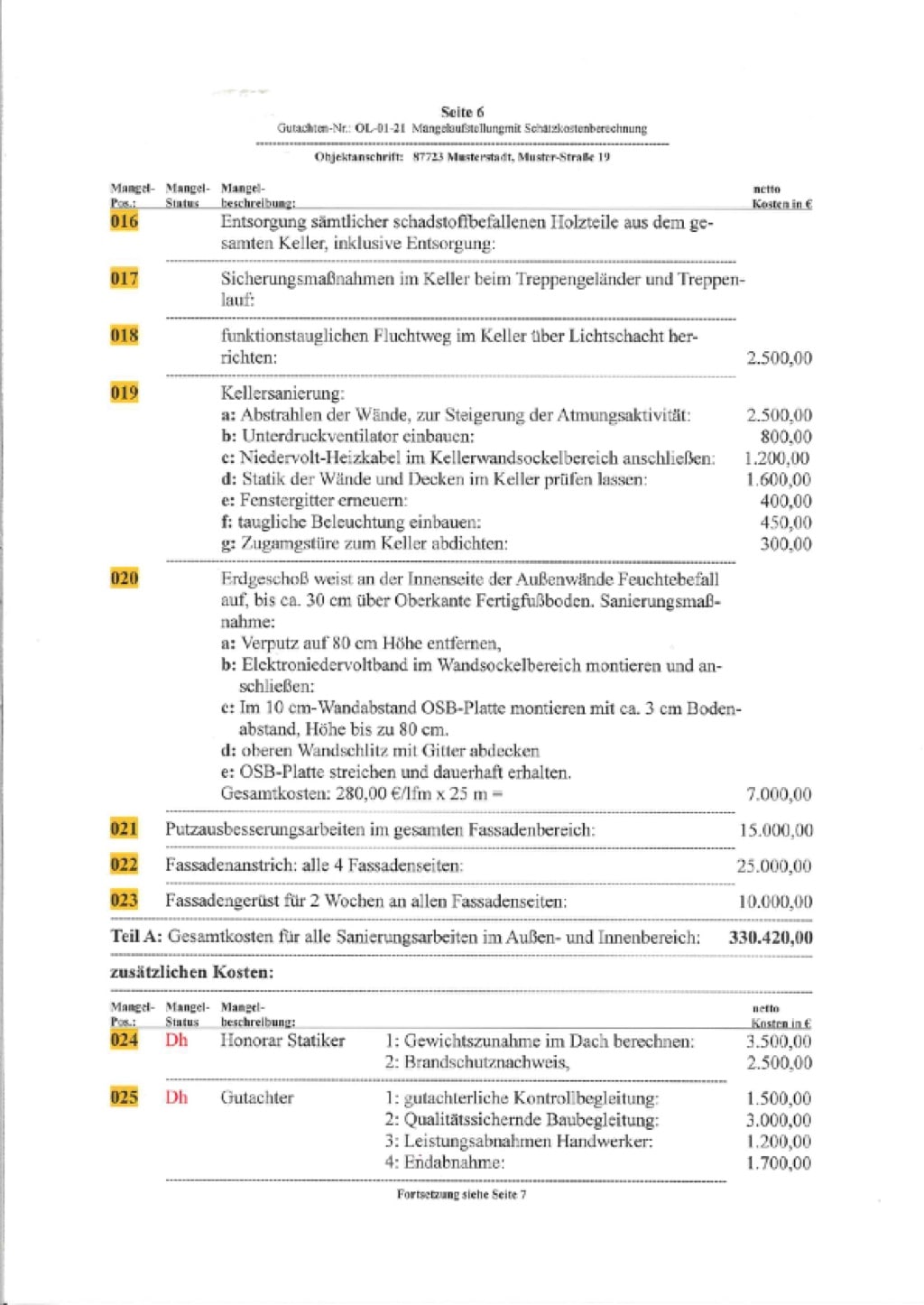 Pos. 2.04: Die schrifliche, beweissichernde Gutachtenerstellung der Begutachtungstage wird vollständig in Papierform aufgenommen. Zusätzlich wird jede notwendige Mangelbeseitigungsmaßnahme erläutert und im Büro berechnet. Die nachweisliche Feststellung der Wiederherstellungskosten in den mangelfreien Zustand sind hier nachvollziehbares und gut verständliches Ziel. Das erfordert manches Mal zusätzliches Informationsmaterial, zum besseren Verständnis auch Handskizzen und Fotos aus meinem Fundus von realisierten Mängelbeseitigungen. Jede einzelne Mangelseite ist abgestempelt, mit Datum der Mangelaufnahme und meiner Unterschrift versehen. Das Gutachten wird komplettiert durch die finale Zusammenfassung aller Mängelkosten. Darin sind die pauschalen Materialkosten, der organisatorische Aufwand der Verantwortlichen, die Teuerungsrate, der Inflationsausgleich und die Mehrwertsteuer unter anderem berücksichtigt.