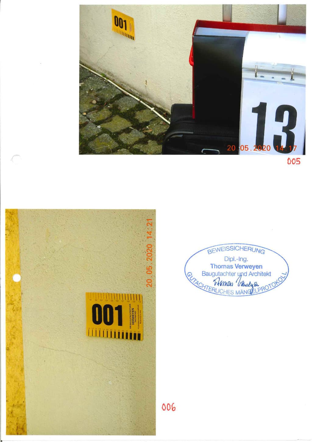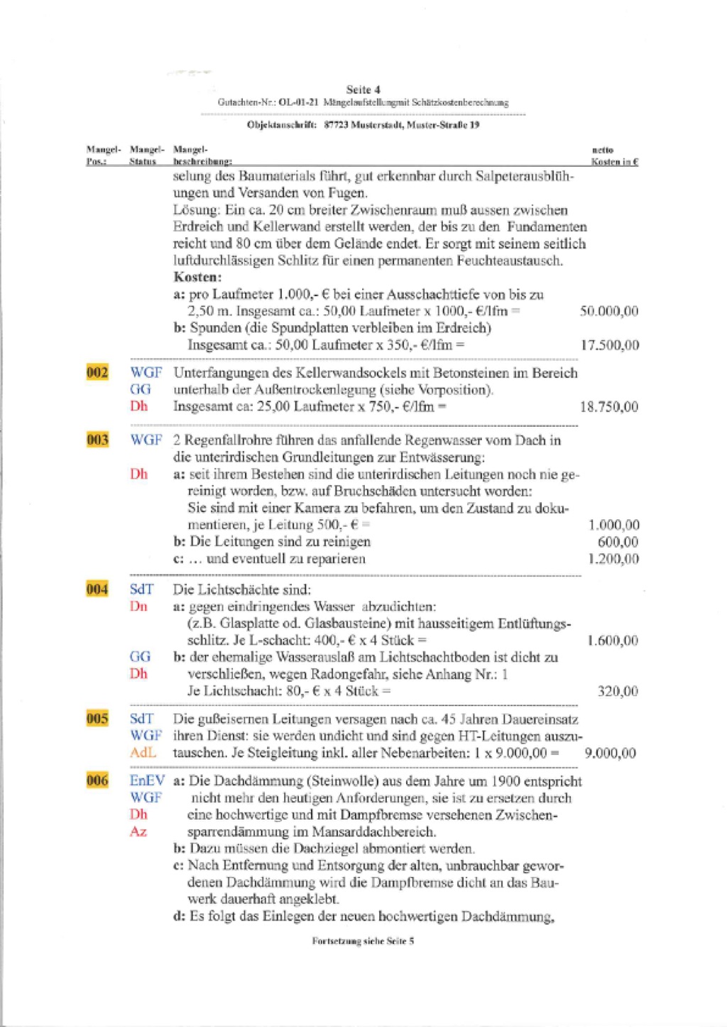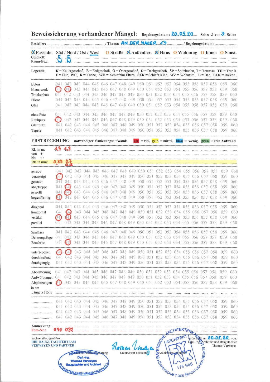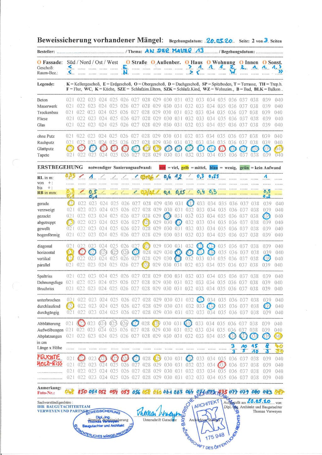 Pos. 2.04: Die schrifliche, beweissichernde Gutachtenerstellung der Begutachtungstage wird vollständig in Papierform aufgenommen. Zusätzlich wird jede notwendige Mangelbeseitigungsmaßnahme erläutert und im Büro berechnet. Die nachweisliche Feststellung der Wiederherstellungskosten in den mangelfreien Zustand sind hier nachvollziehbares und gut verständliches Ziel. Das erfordert manches Mal zusätzliches Informationsmaterial, zum besseren Verständnis auch Handskizzen und Fotos aus meinem Fundus von realisierten Mängelbeseitigungen. Jede einzelne Mangelseite ist abgestempelt, mit Datum der Mangelaufnahme und meiner Unterschrift versehen. Das Gutachten wird komplettiert durch die finale Zusammenfassung aller Mängelkosten. Darin sind die pauschalen Materialkosten, der organisatorische Aufwand der Verantwortlichen, die Teuerungsrate, der Inflationsausgleich und die Mehrwertsteuer unter anderem berücksichtigt.