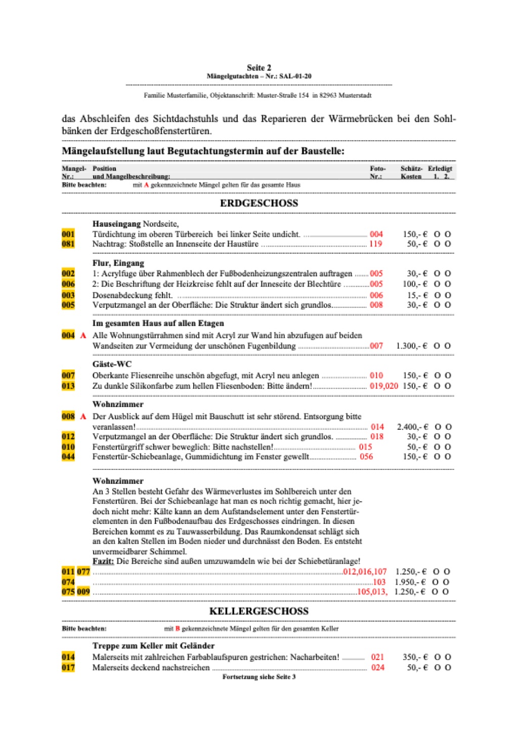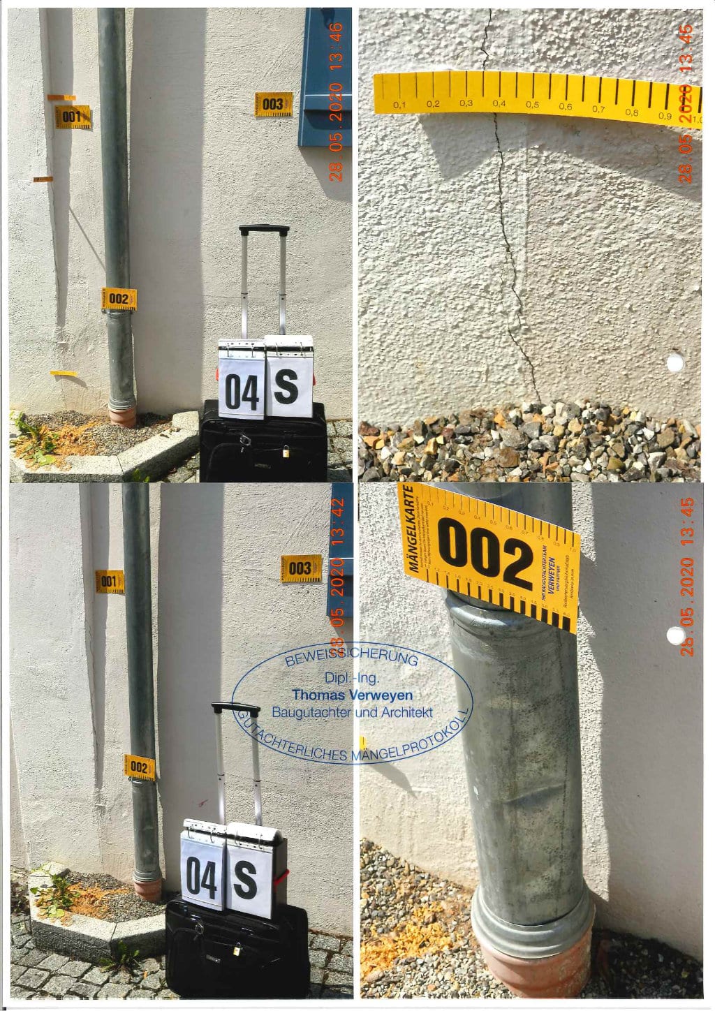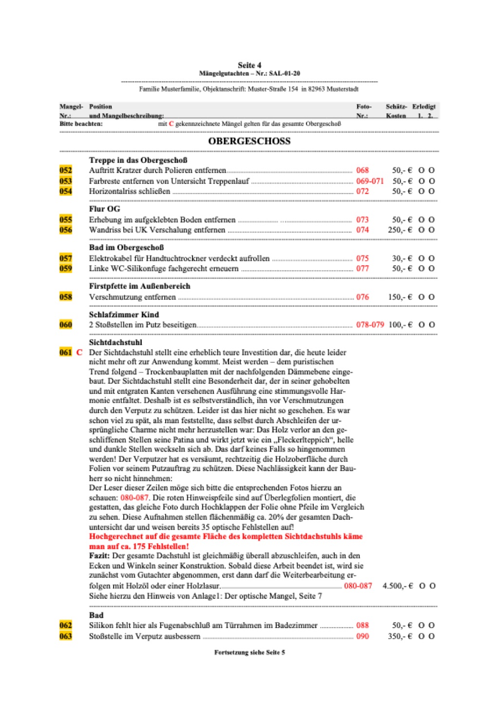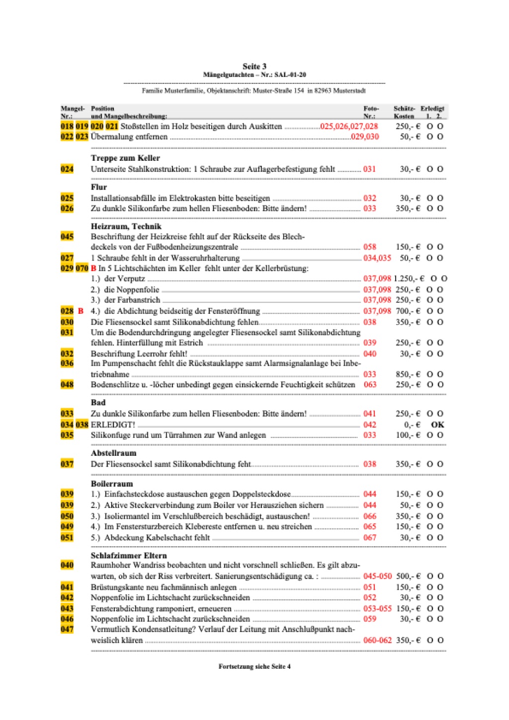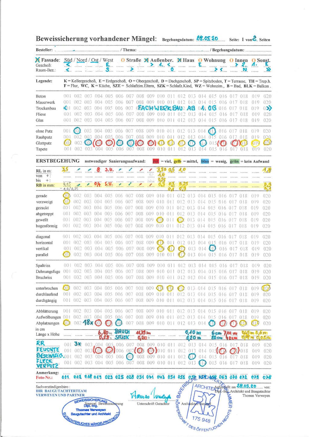 - durch Fotoaufnahmen von jedem einzelnen Mangel (soweit er ohne Bauteilöffnungen erkennbar ist),