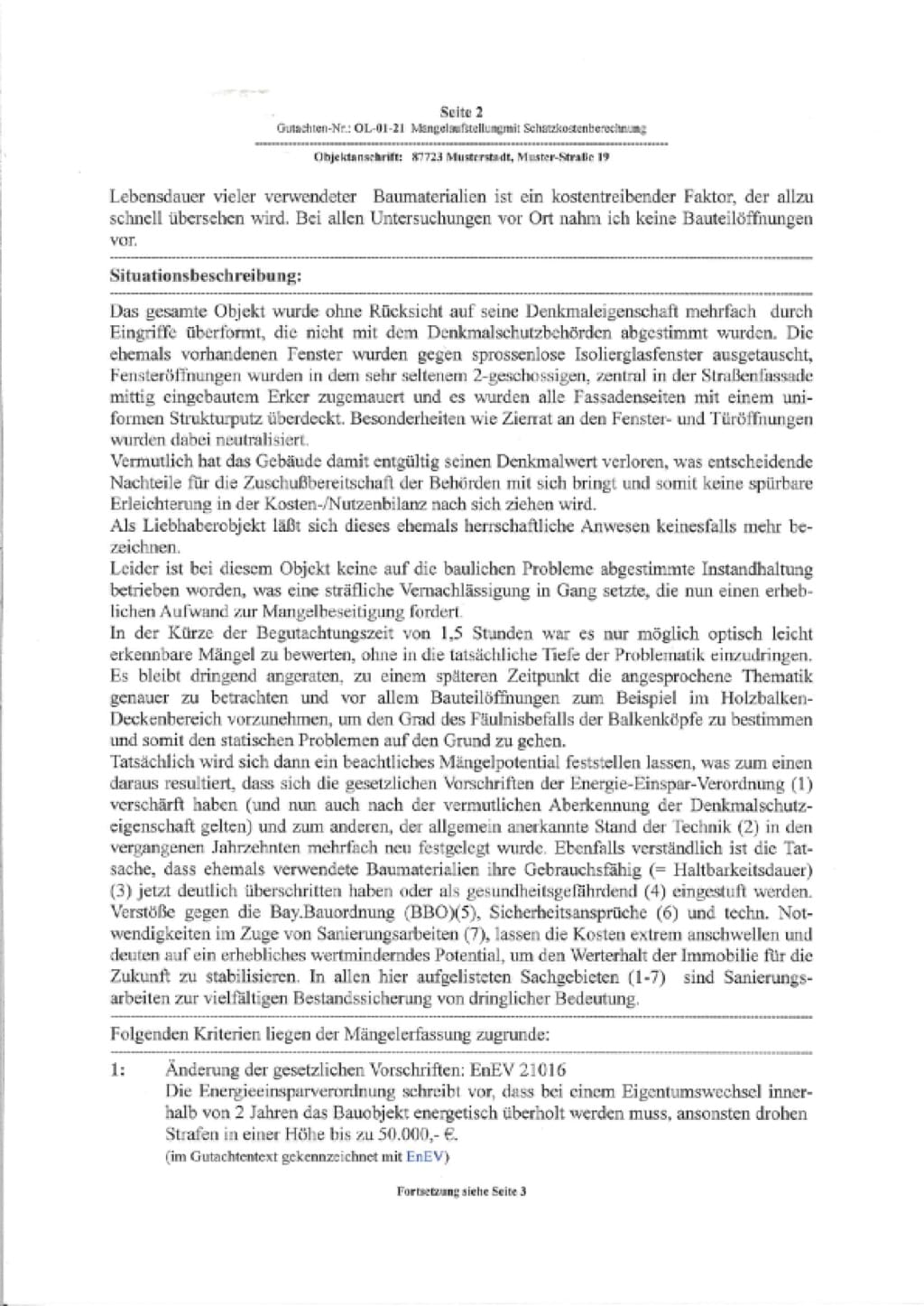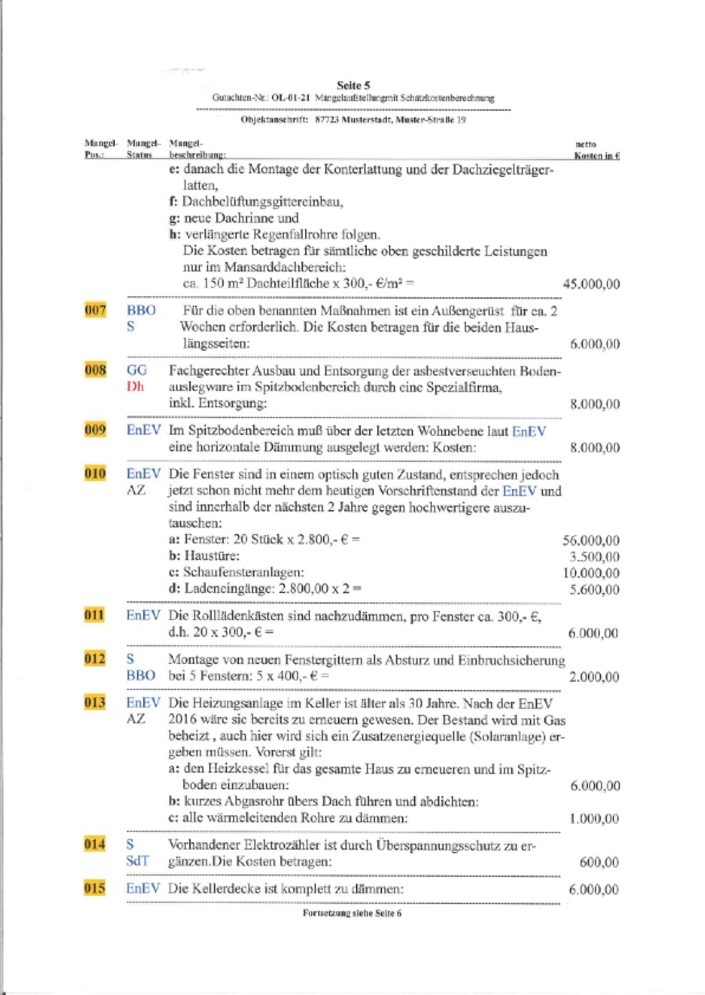 Beispiel: Gutachten Mängelaufstellung mit Schätzkostenberechnung im Denkmalschutzbereich