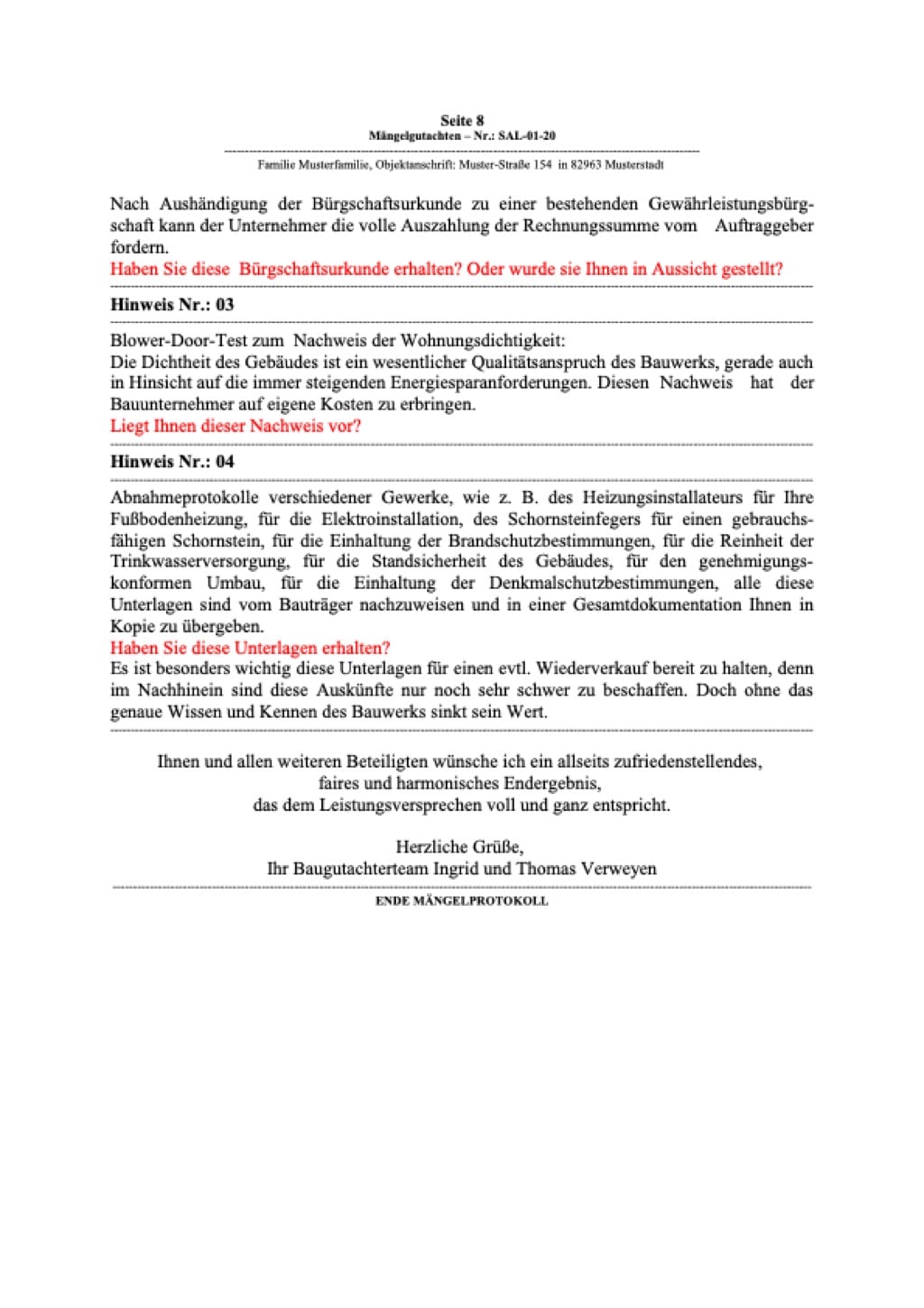 - Banken und Behörden sind von Beweissicherungen beeindruckt, wegen der detaillierten Auseinandersetzung mit jedem Einzelfall.
