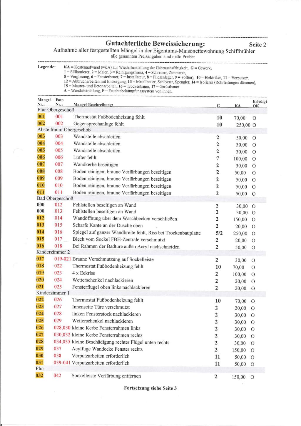 Beispiel: Mängelbericht Wohnung mit Schätzkostenangabe