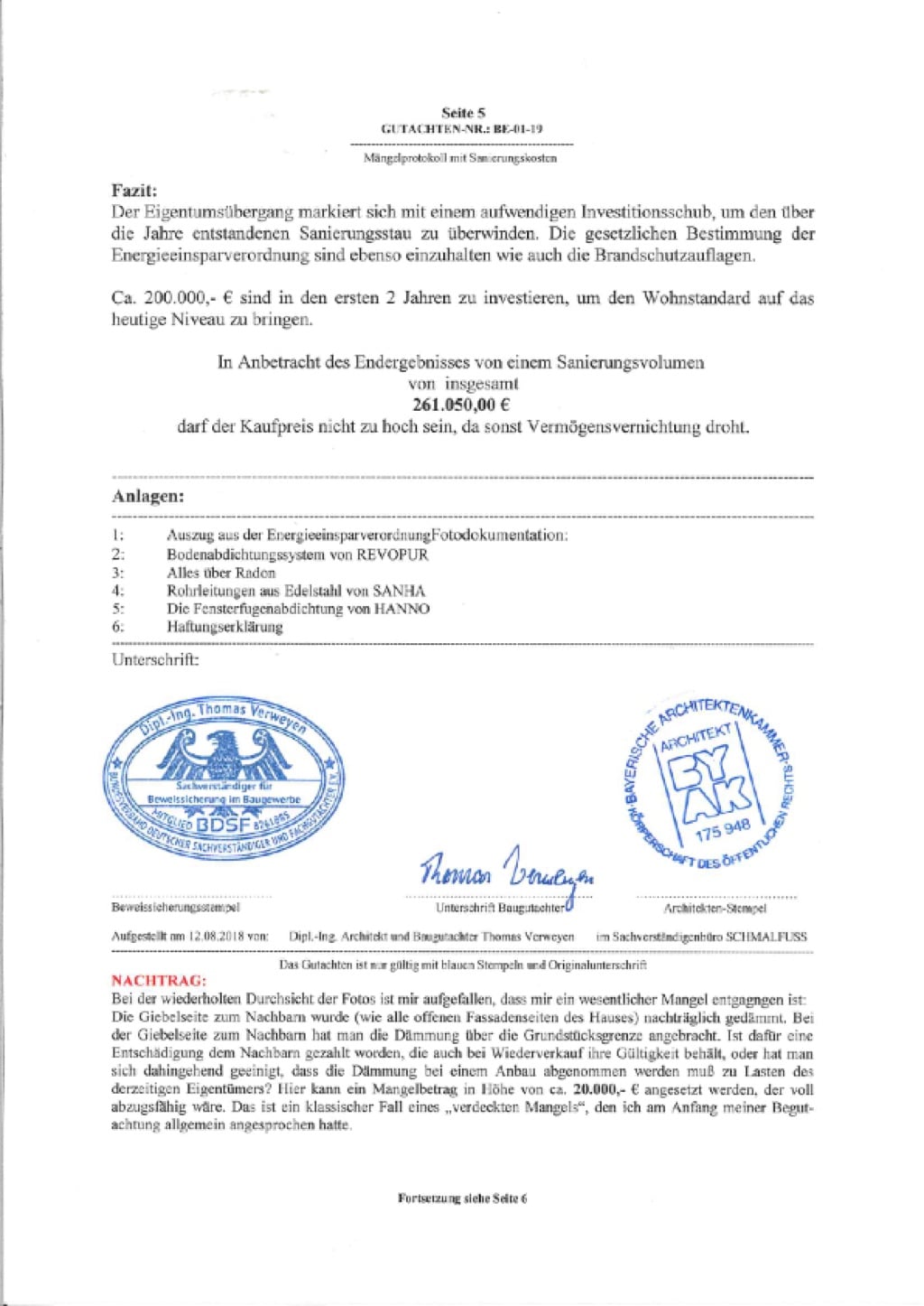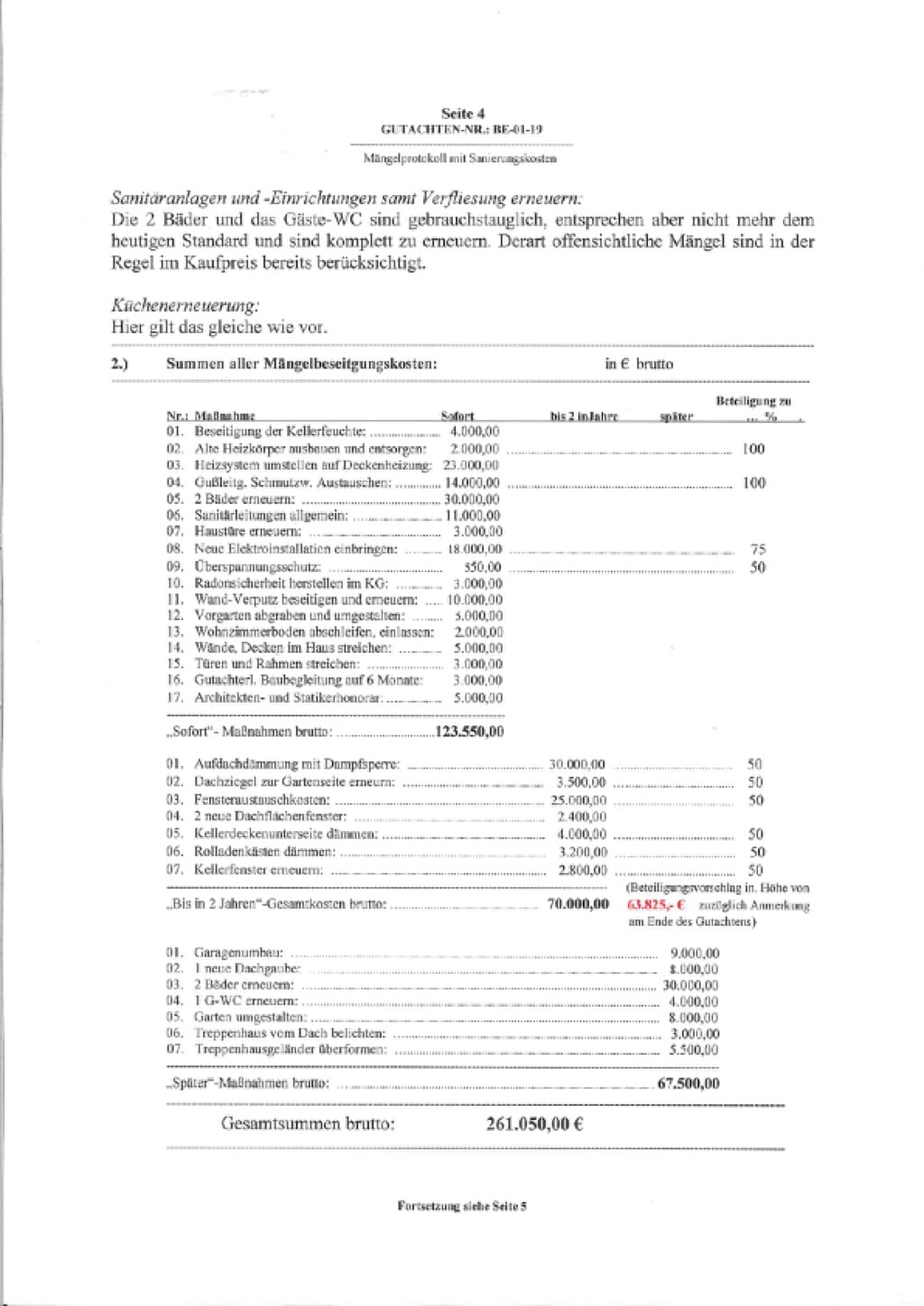 f.) Laut geltender Gesetzeslage ist es gestattet die Gesamtkosten der Mängelbeseitigung zu verdoppeln: Dies nennt man den Druckzuschlag, der den Bauträger zwingen soll seiner Mangelbeseitigungspflicht nachzukommen. Auch das wird im Mängelprotokoll-Gutachten deutlich ausgewiesen.