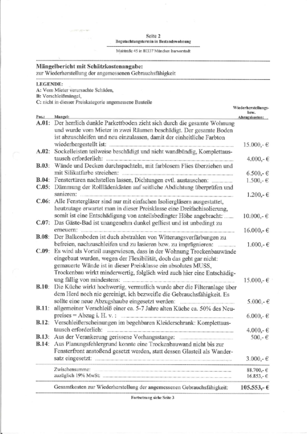 Beurteilung sämtlicher optische erkennbaren Wohnungsmängel mit Schätzkostenaufstellung zur Wiederherstellung des geschuldeten mangelfreien Bauzustands