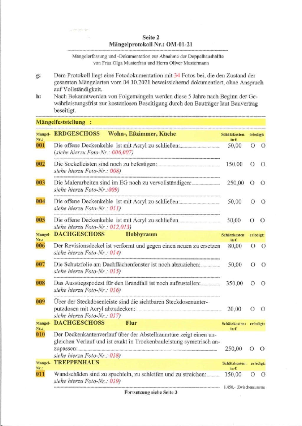 h.) Meine Frau begleitet uns am Termin und führt das Mängelprotokoll, damit keine Info verloren geht.