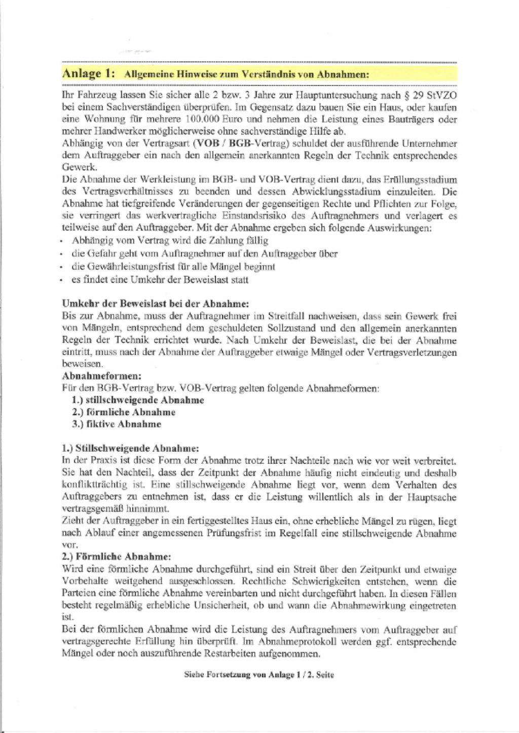 e.) Sollte die Mängelzahl zu hoch sein rate ich Ihnen die Abnahme zu verweigern und zu einem späteren Termin anzusetzen. Dieser zweite Termin kostet die Hälfte vom ersten Termin zusätzlich.
